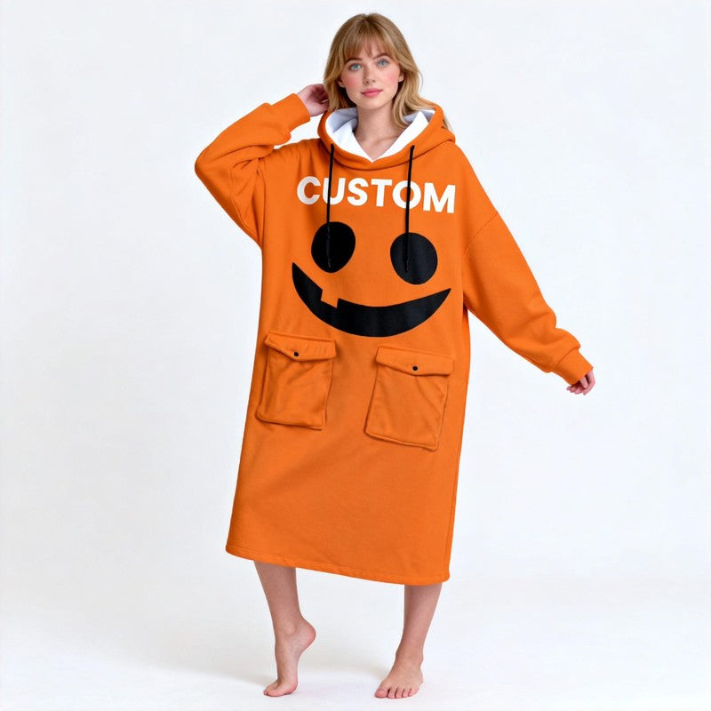 Halloween Custom Name Wearable Hoodie Blanket – Black & Orange Emoji Face Design