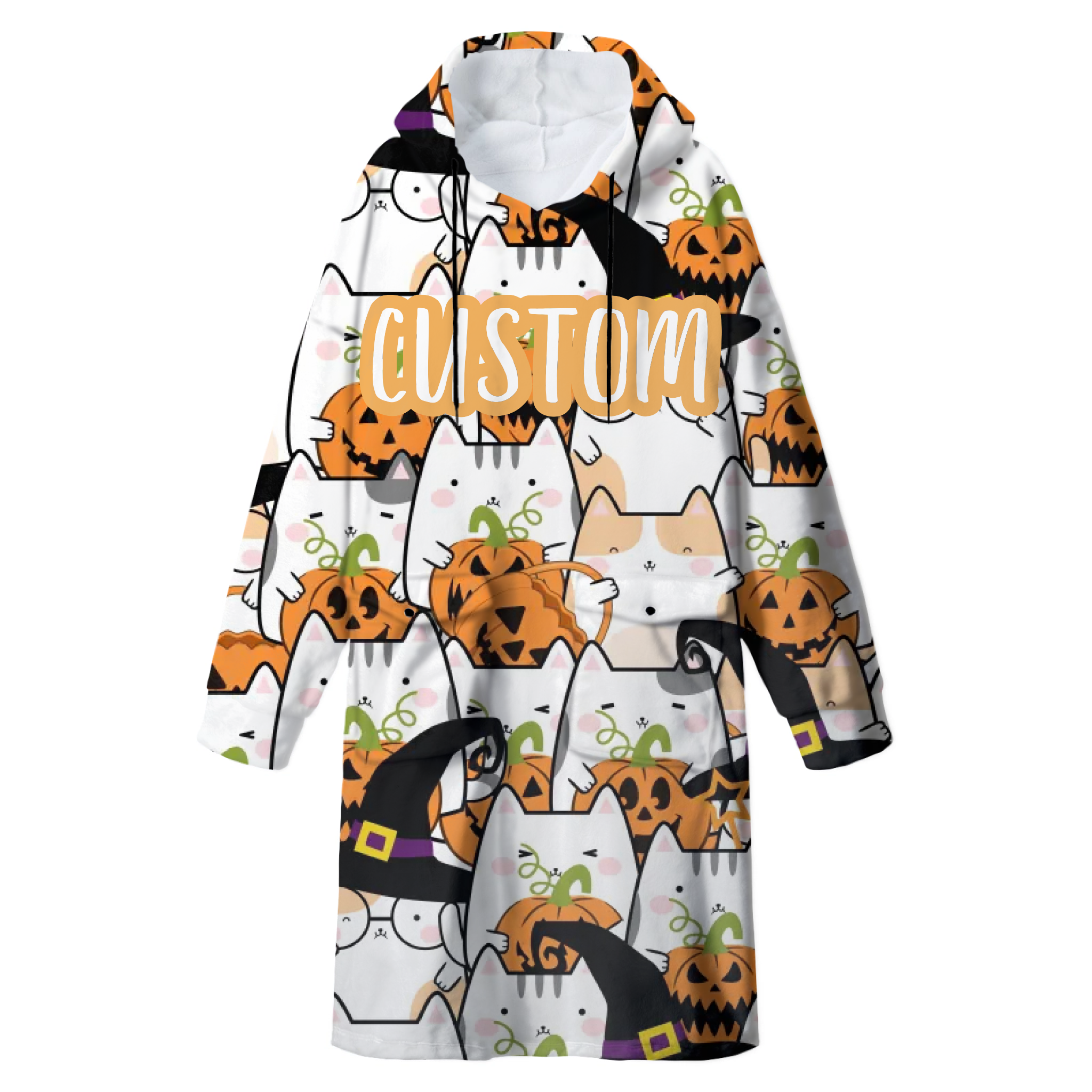 Celebrate spooky season in style with our Custom Halloween Hooded Blanket! Featuring adorable cats, pumpkins, and witch hat designs, this cozy blanket is the perfect mix of comfort and festive fun.