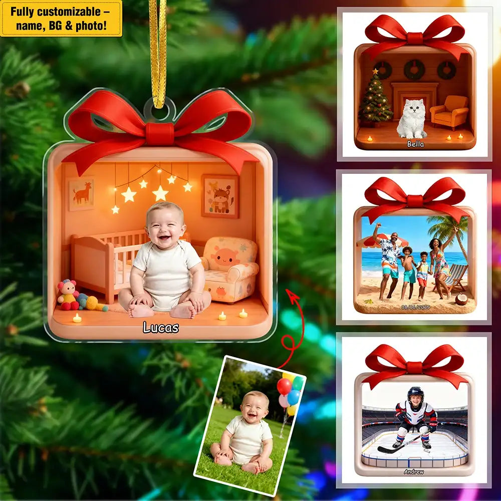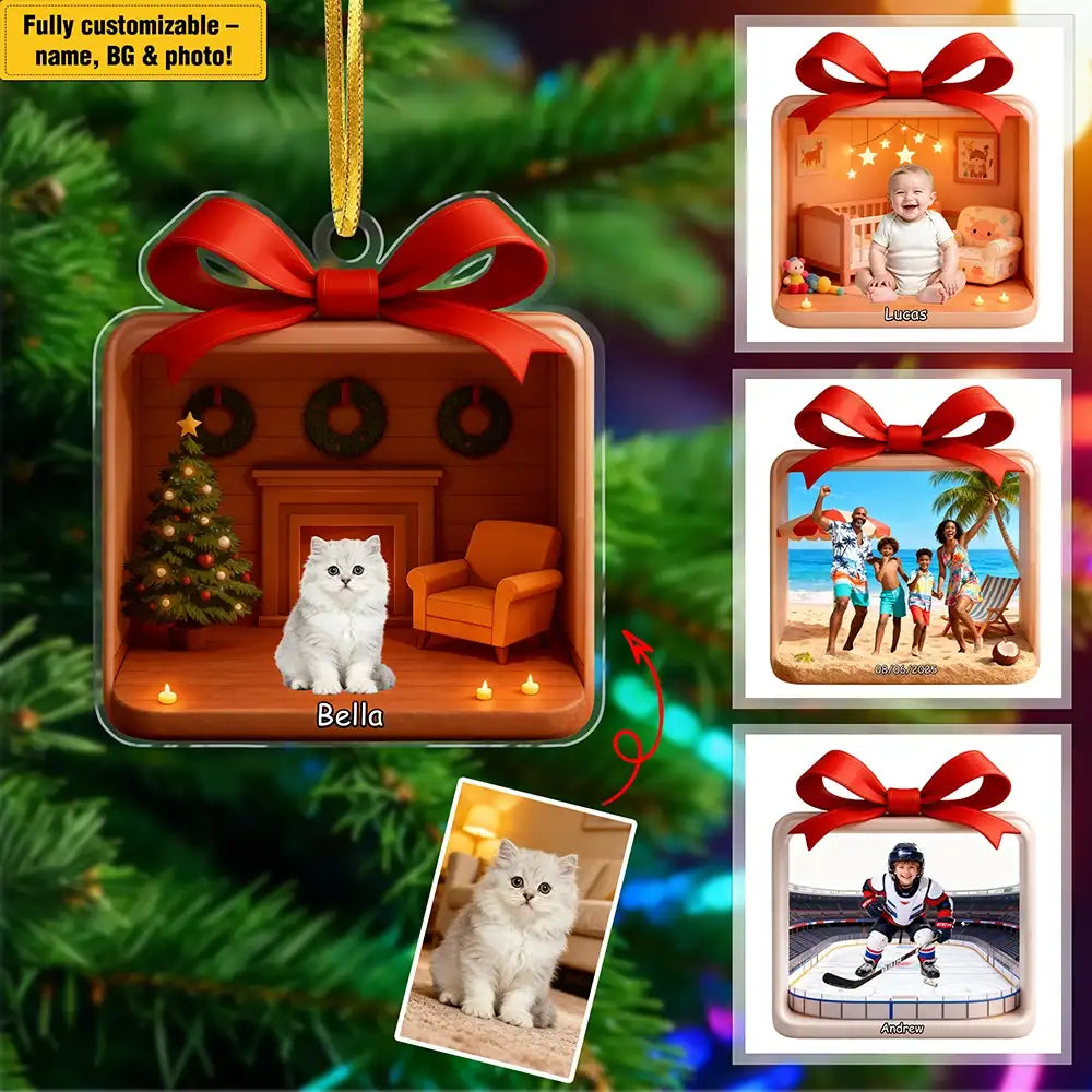This personalized acrylic Christmas pendant features a warm holiday room scene designed to highlight your pet’s photo. Simply upload a picture of your dog or cat and customize the name to create a unique and meaningful decoration. Made from high-quality acrylic with vivid printing, this pendant brings a festive and personal touch to any Christmas tree. It is an ideal gift for pet owners and a perfect way to celebrate your furry companion during the holidays.