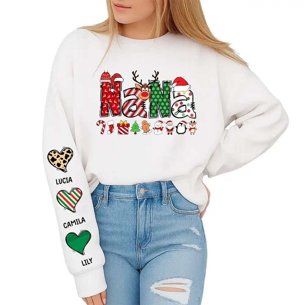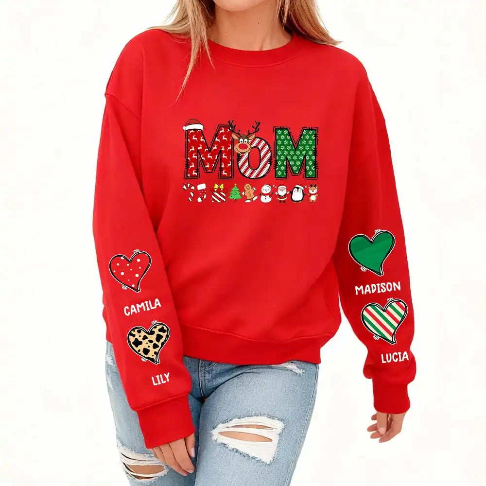 Personalized MUM Christmas Sweatshirt – Custom Hearts and Names on Sleeves