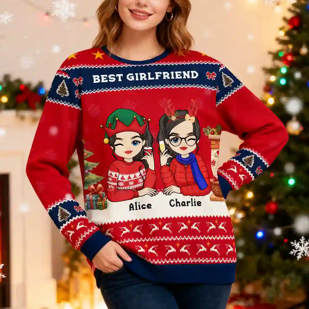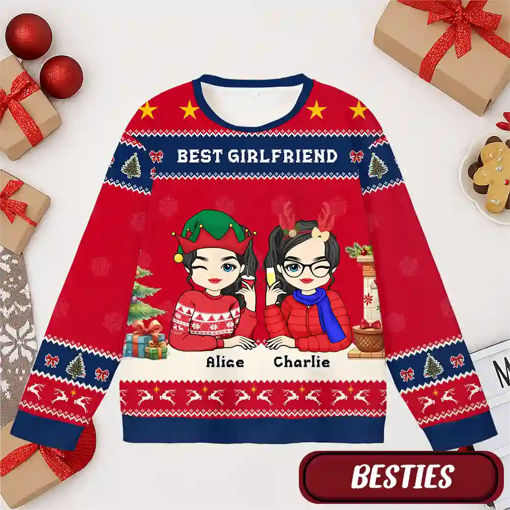 Make this Christmas extra special with our Personalized Best Friend Ugly Christmas Sweater! Designed to celebrate friendship and laughter, this cozy sweater features two adorable cartoon characters that represent you and your bestie—complete with customizable names and festive outfits.