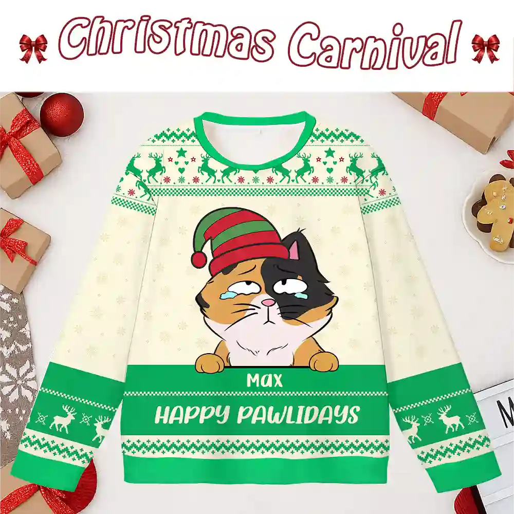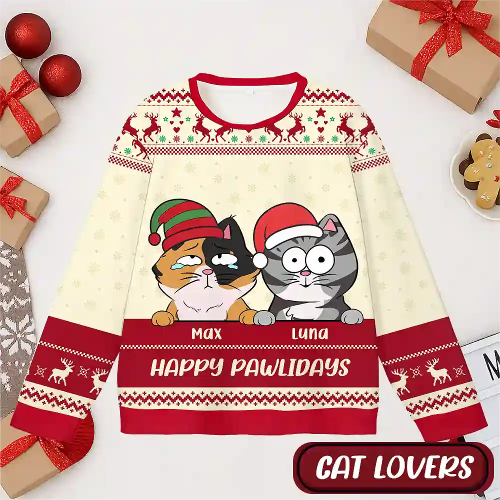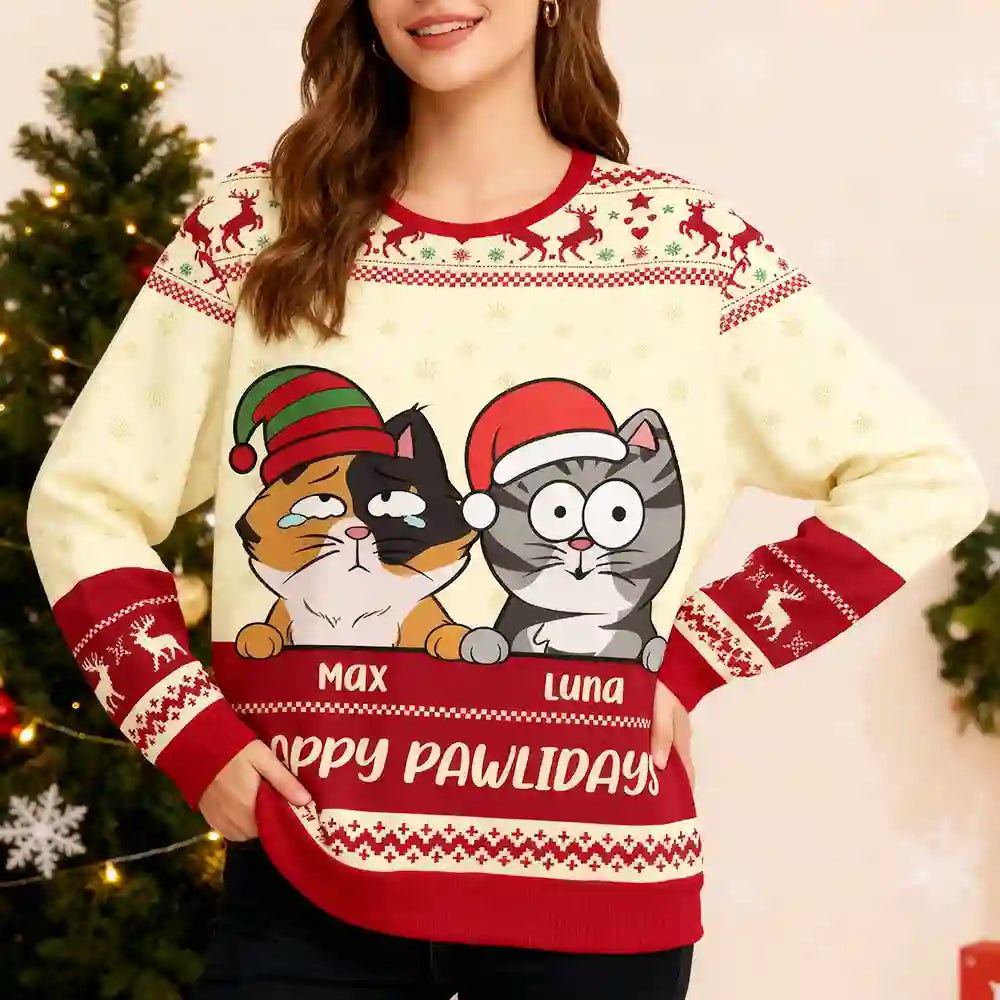 Bring your holiday spirit to life with our Custom “Happy Pawlidays” Cat Ugly Christmas Sweater – the must-have festive piece for every cat lover this season.