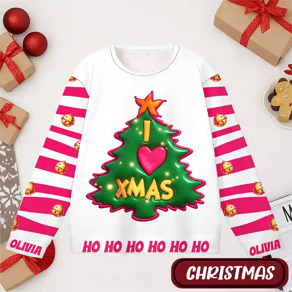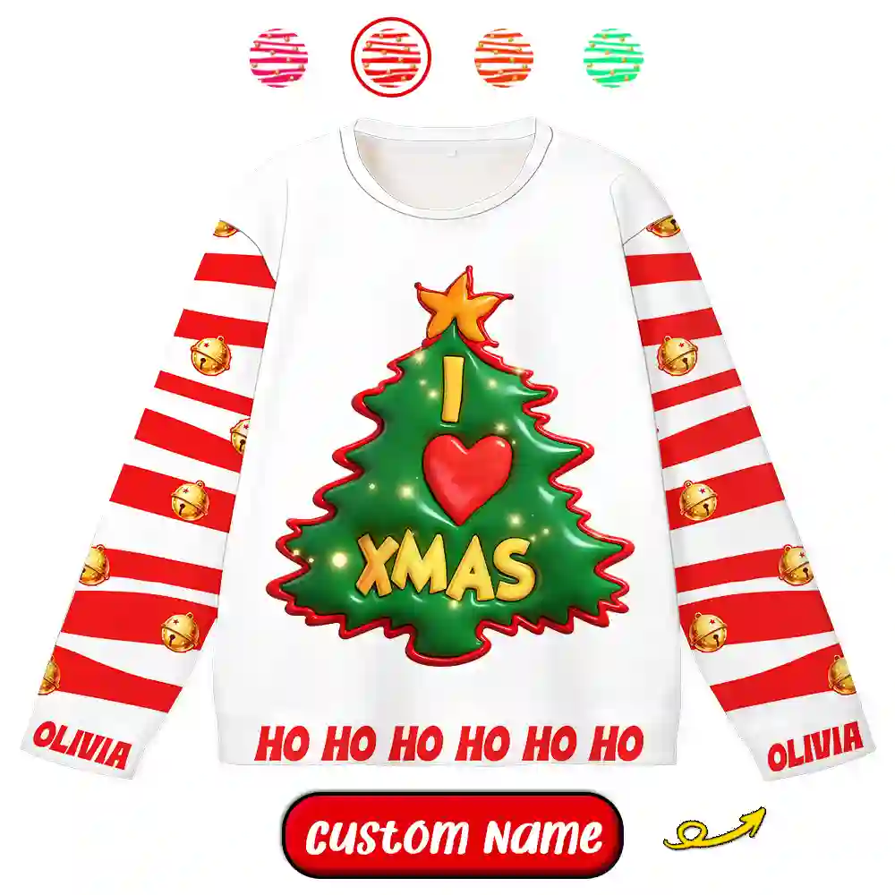 The bold “I LOVE XMAS” tree design is full of holiday spirit, while the striped sleeves with jingle bells bring a fun, eye-catching look. Personalize the sweater by adding your name (or a loved one’s), making it a one-of-a-kind Christmas keepsake that spreads joy and laughter.