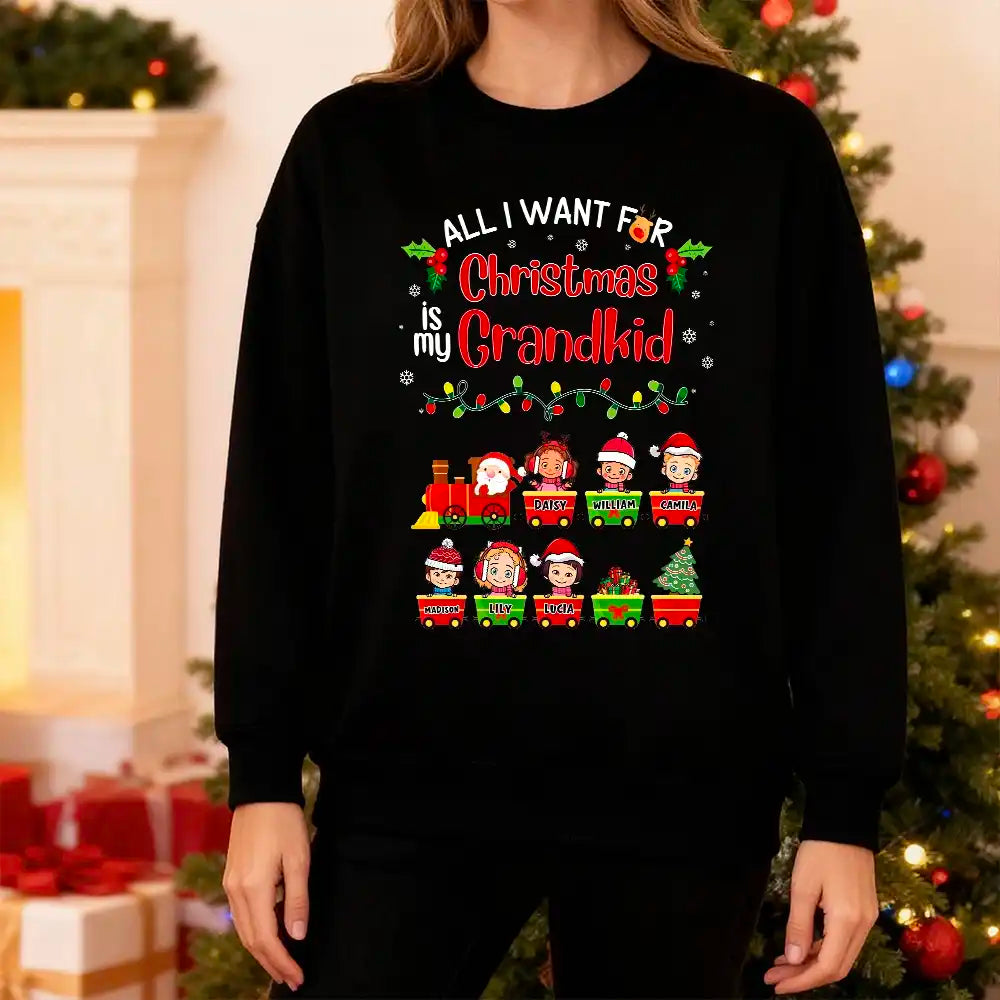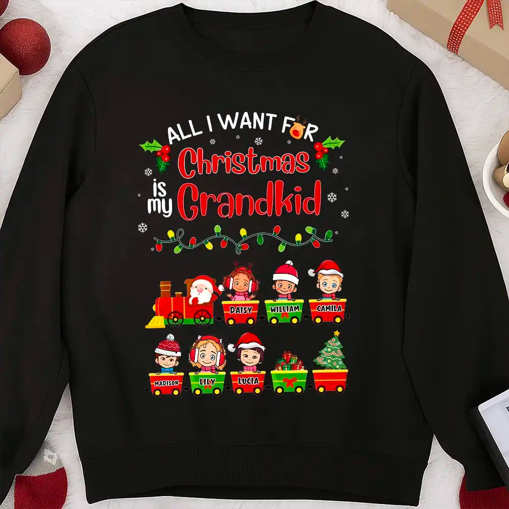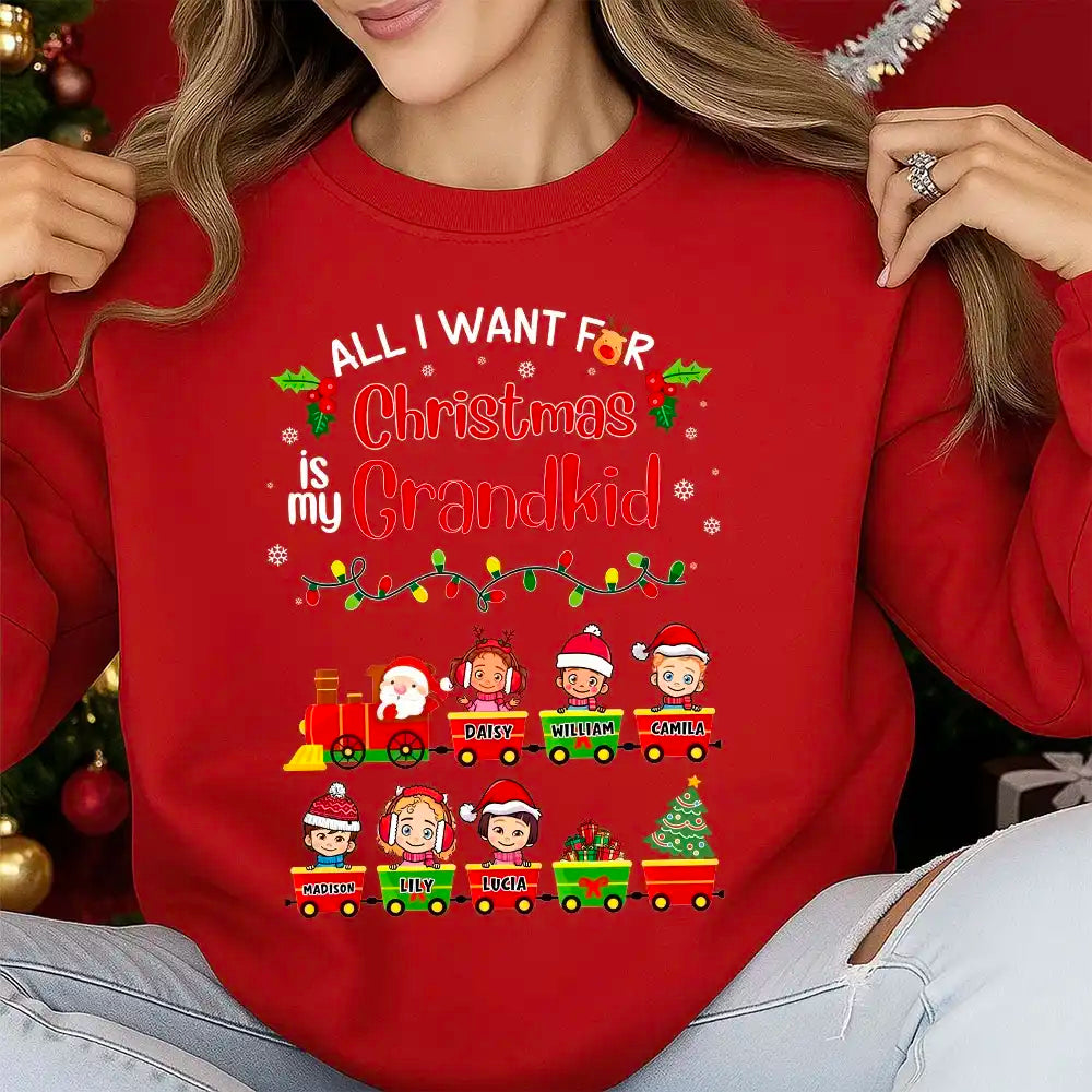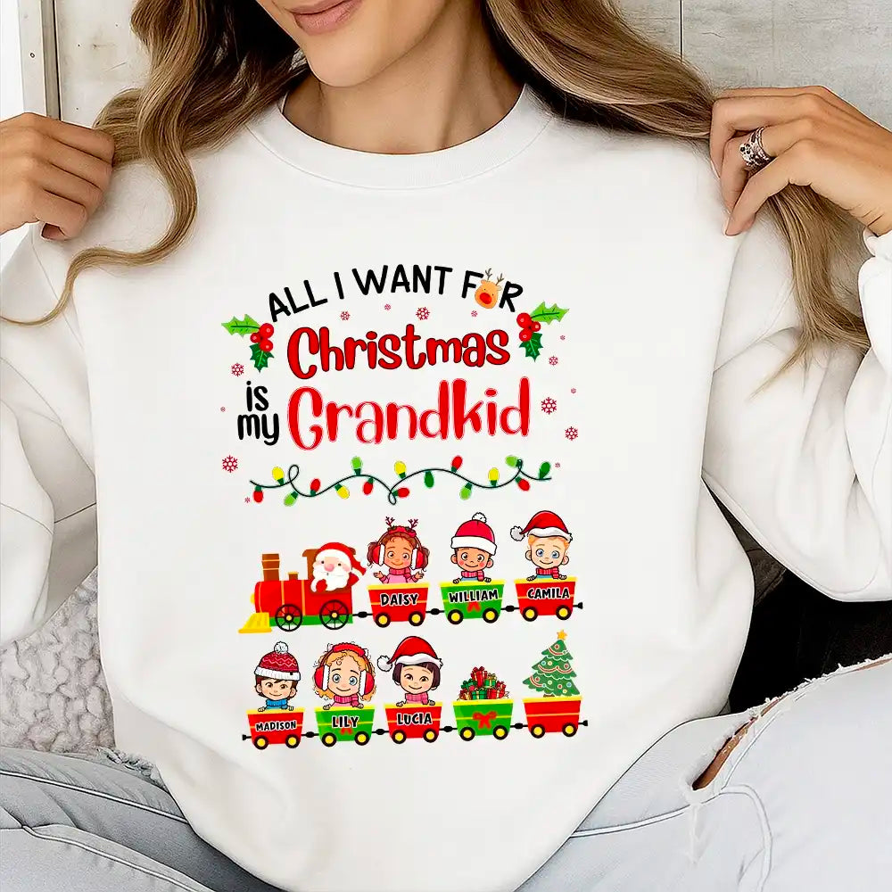 Make Christmas extra special with this personalized “All I Want For Christmas Is My Grandkid” T-shirt、Sweatshirt、Hoodie. Each adorable grandkid rides on the festive Christmas train — you can choose the Kids character style, quantity, and add their names to create a unique family keepsake.