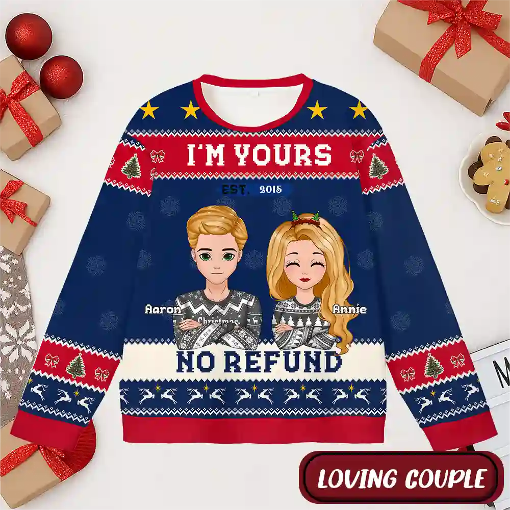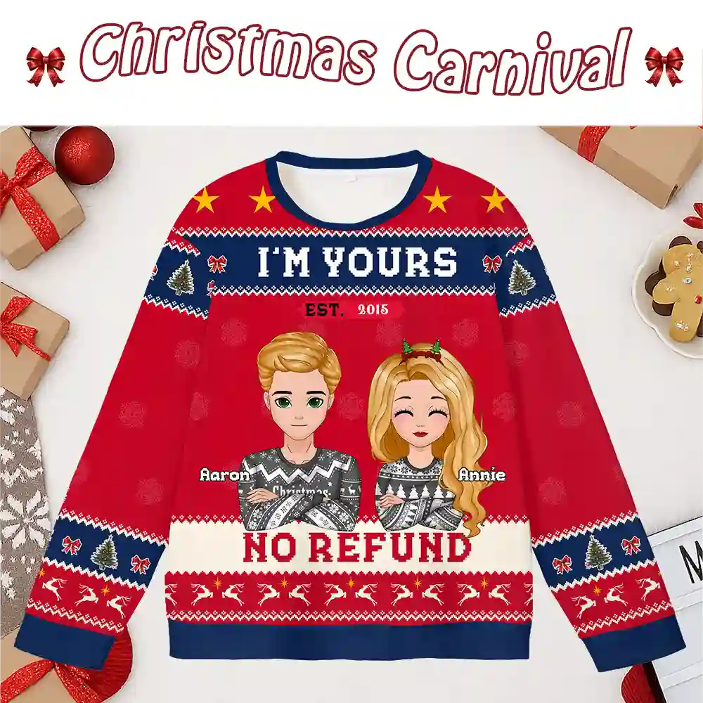 Bring holiday humor and romance together with our Personalized “I’m Yours No Refund” Couple Christmas Ugly Sweater — the perfect festive statement for couples who love to laugh!