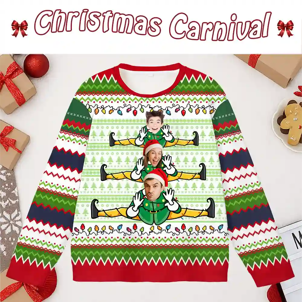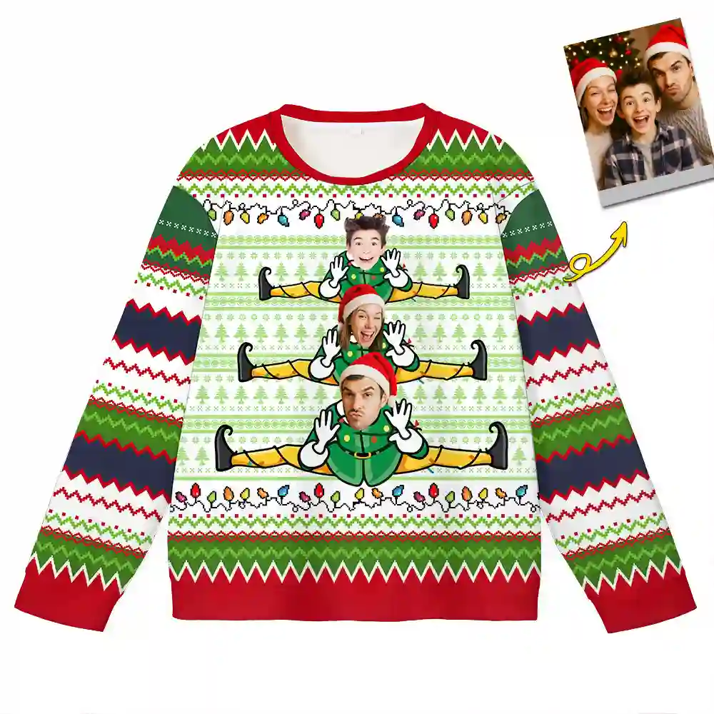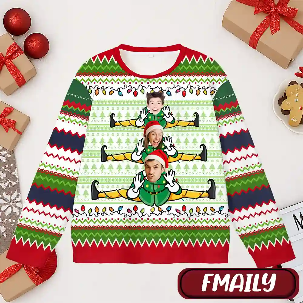 Make your Christmas unforgettable with our Personalized Elf Christmas Ugly Sweater! This hilarious holiday sweater lets you upload family photos and turn everyone into playful elves doing the splits. Perfect for Christmas parties, family gatherings, or white elephant gift exchanges, it’s guaranteed to spread laughter and festive cheer.