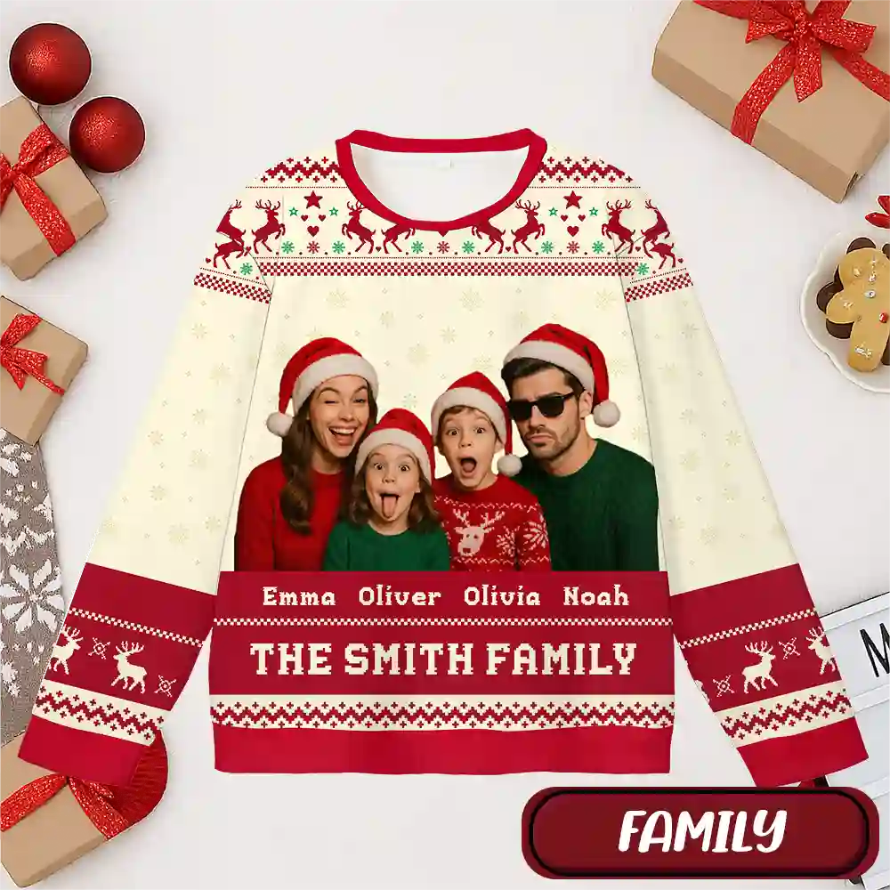 This one-of-a-kind sweater lets you upload your favorite family photo and add each family member’s name, creating a truly unique piece of holiday apparel. Whether for festive family portraits, Christmas parties, or as a meaningful gift, this sweater is the perfect way to celebrate togetherness.
