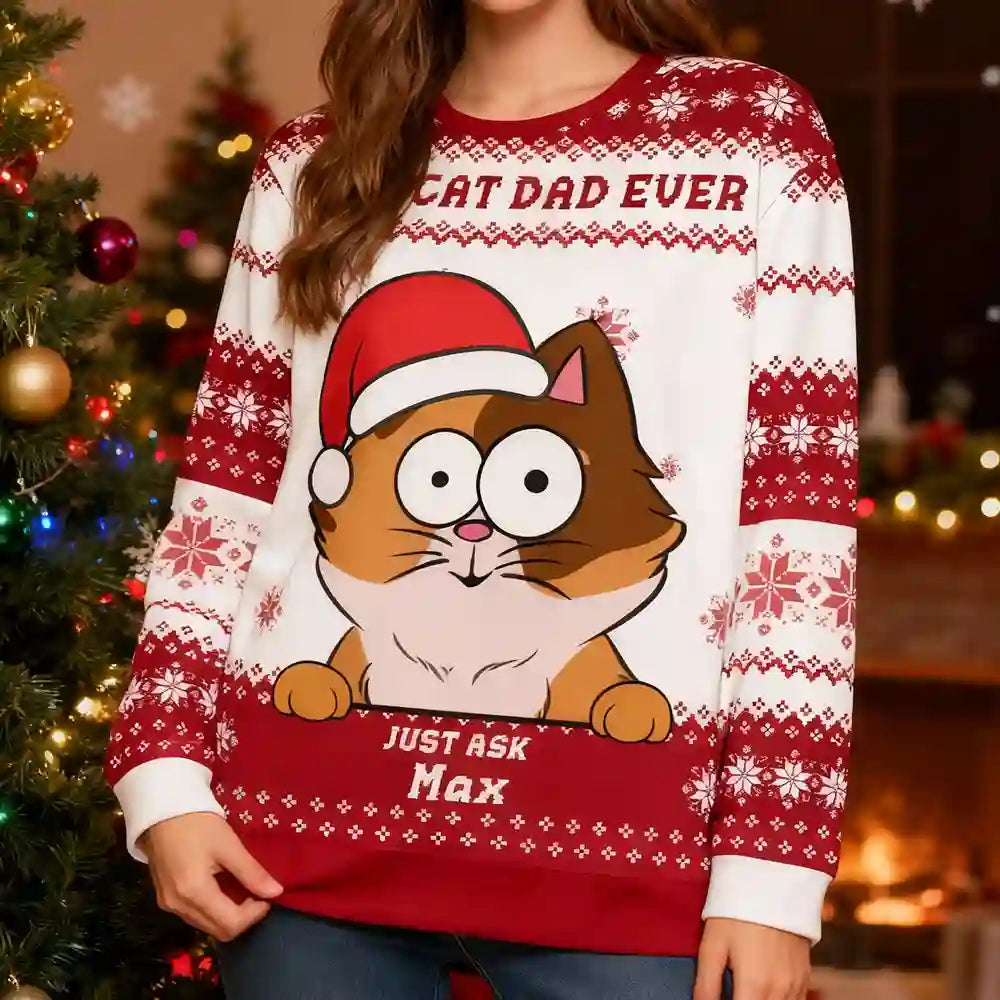 Custom Cat Christmas Ugly Sweater – Personalized Holiday Sweatshirt with Snowflake Pattern, Upload Pet Photo, Add Name, Best Gift for Cat Moms & Dads