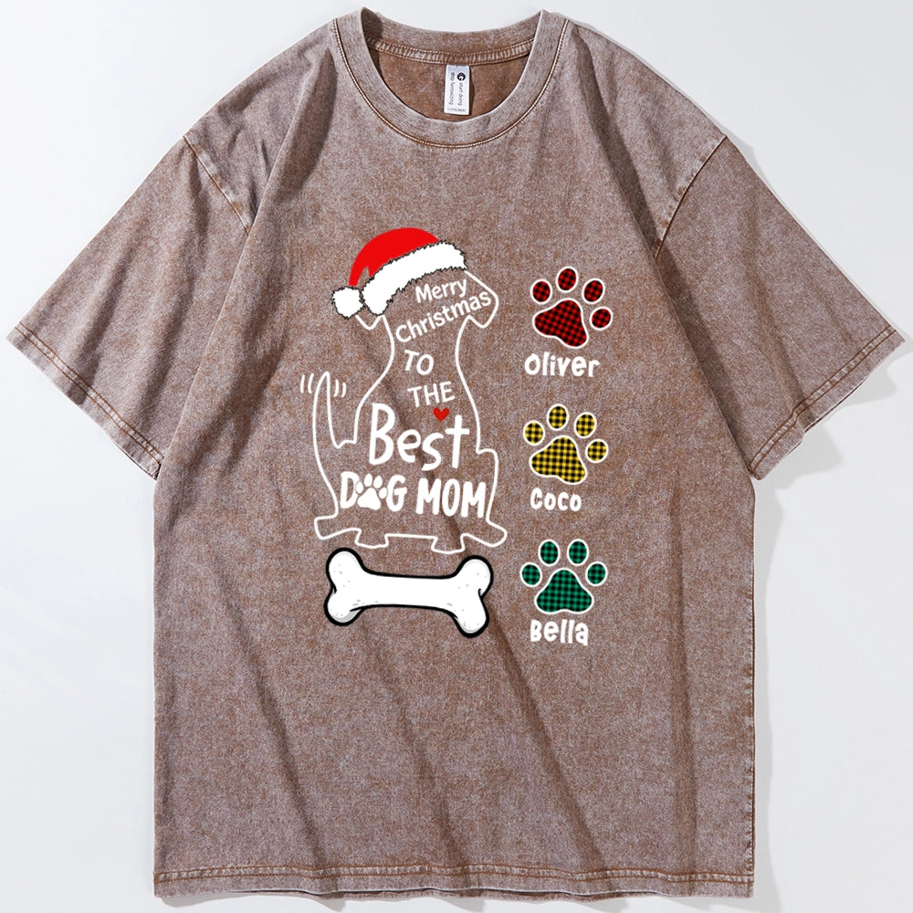 Celebrate the holidays with a Christmas T-shirt designed just for dog moms! Featuring a festive dog silhouette, printed with your pet's name and paw print, and a cheerful holiday theme, this T-shirt is the perfect gift for any proud pet lover. Customize with up to three dogs' names for a thoughtful and stylish gift this season.