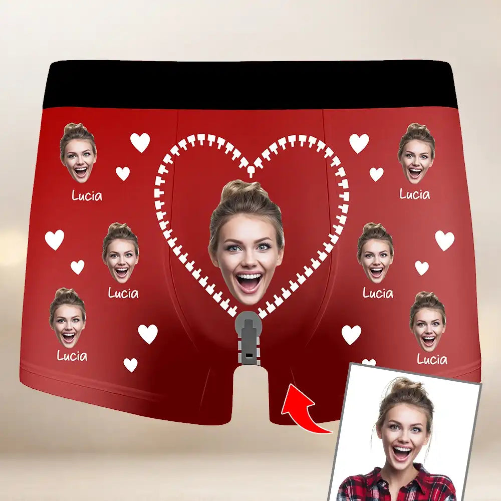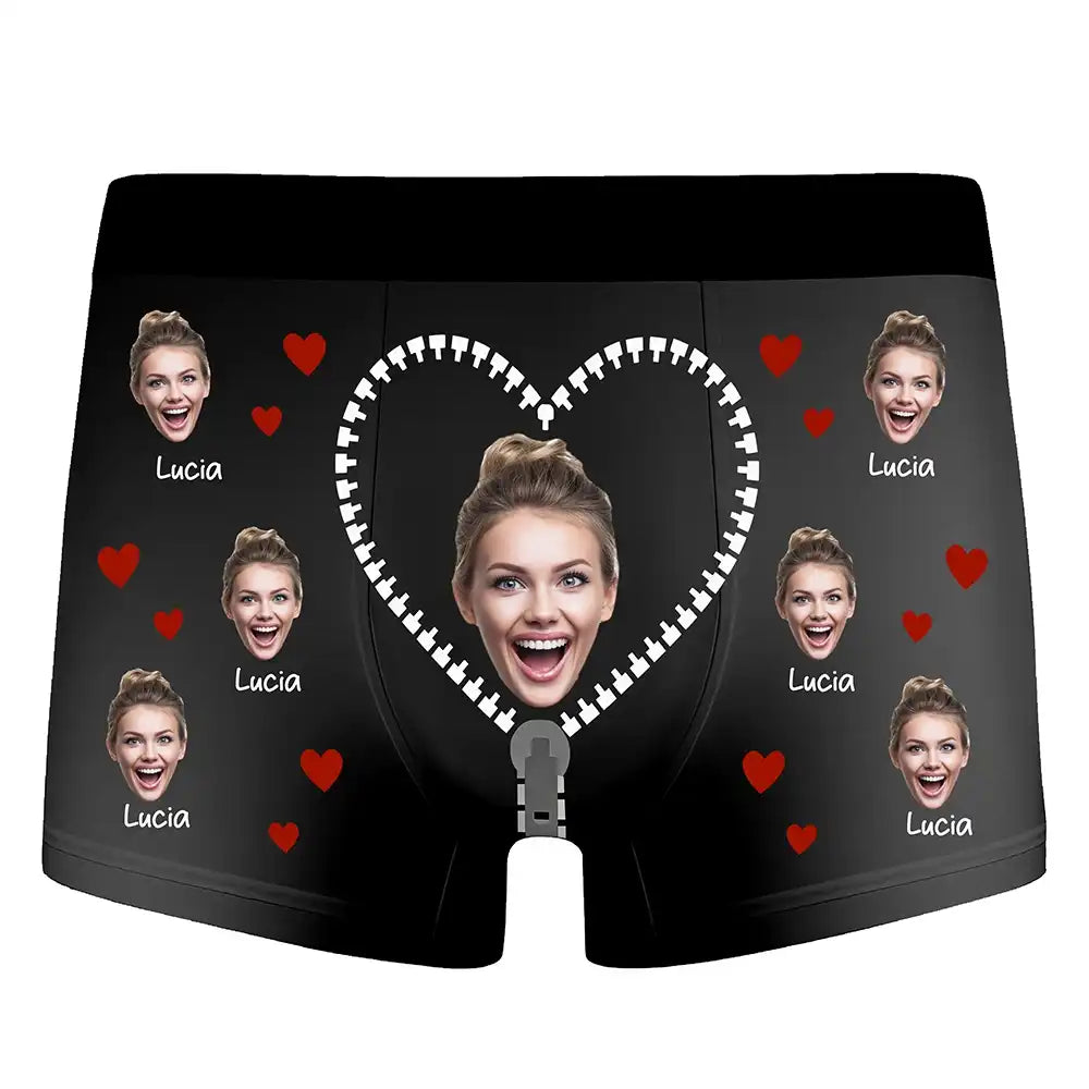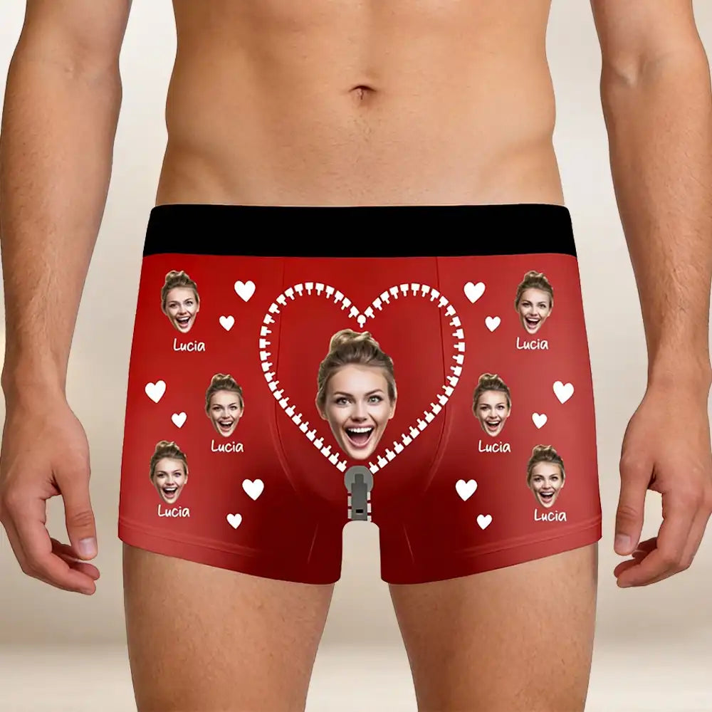 These personalized men's boxer briefs feature your custom face photo in a playful heart and zipper design, creating a unique and memorable gift for your partner. Made from soft, breathable fabric with high-quality all-over printing, these boxers offer comfort and personality in one. Ideal for Valentine’s Day, anniversaries, birthdays, or any romantic occasion, this custom gift adds a fun and intimate touch to your relationship. Simply upload a photo to create a pair of boxer briefs that your partner will never forget.