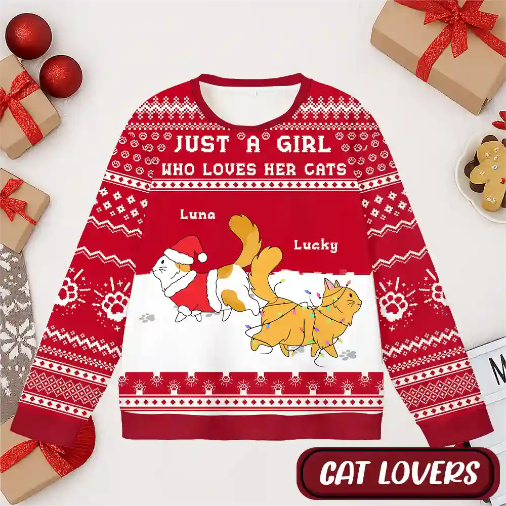 For every proud cat mom, this “Just A Girl Who Loves Her Cats” Ugly Christmas Sweater is the ultimate way to celebrate the holidays with your furry family! Featuring adorable illustrated cats in festive costumes, this cozy sweater can be fully personalized to look just like your real pets.