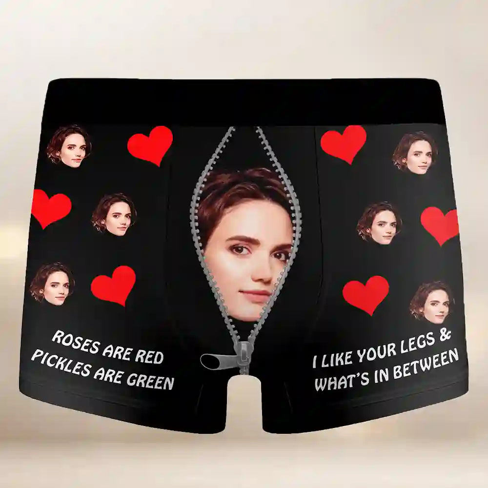 Add a playful twist to romance with our Funny Custom Face Boxer Briefs! Featuring your loved one’s face, bold red hearts, and cheeky quotes like “Roses are red, pickles are green” and “I like your legs & what’s in between”, these boxers are the ultimate personalized gift that’s equal parts hilarious and flirty.