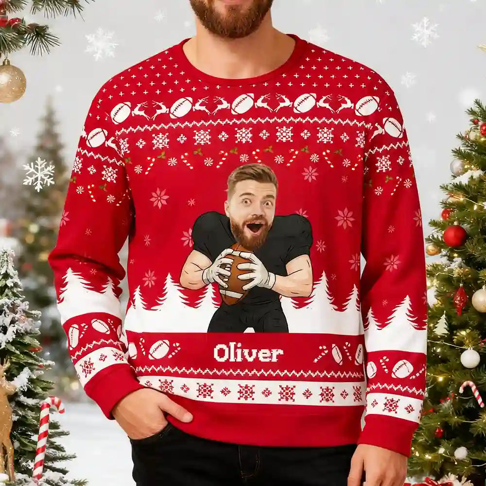 This Funny Football Fan Ugly Christmas Sweater lets you bring your A-game straight to the holiday party. Upload your face and name to become the star quarterback of Christmas chaos — because nothing says “holiday spirit” like scoring laughs at the ugly sweater contest.