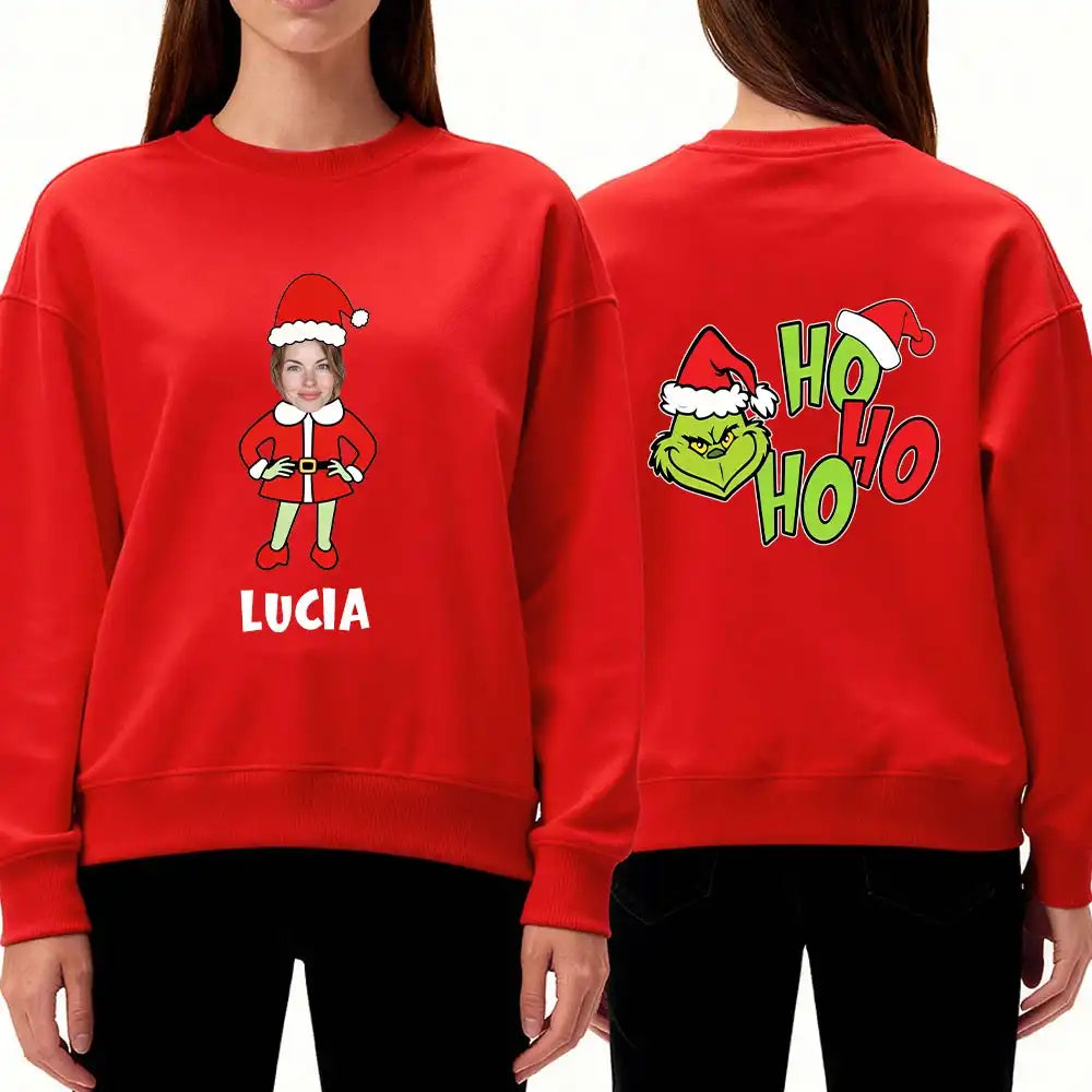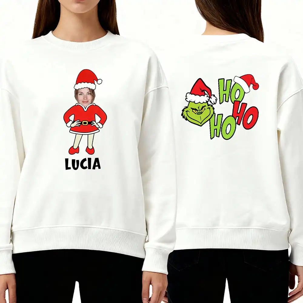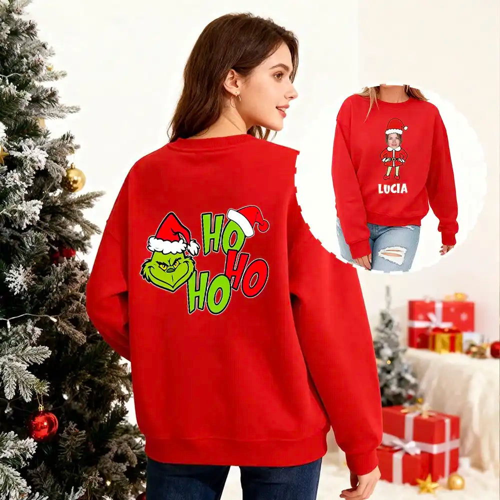 Get ready for the holidays! This personalized Christmas sweatshirt features your own photo (automatically generated avatar) and name on the front, and a playful "Ho Ho Ho" Grinch graphic on the back.