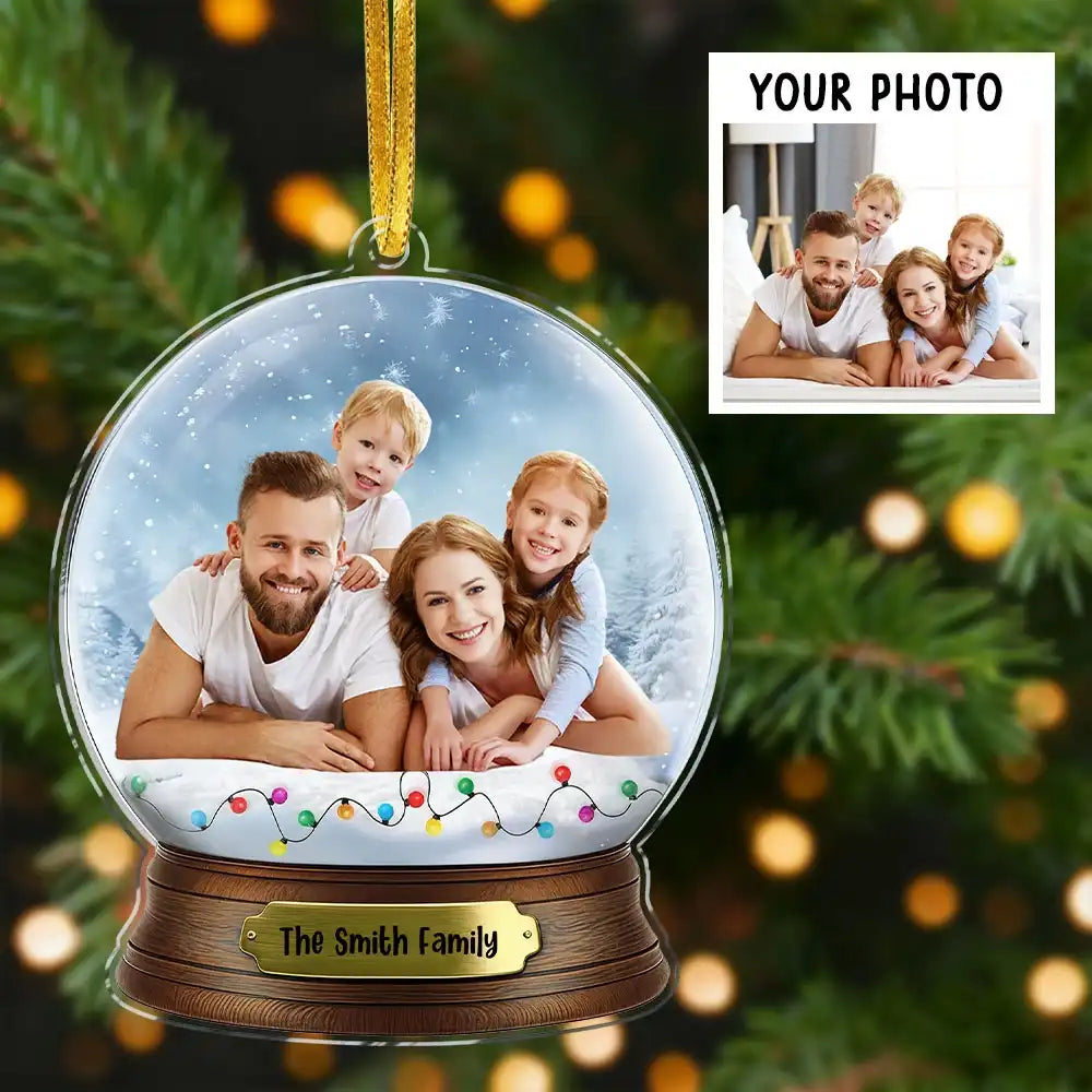 This personalized acrylic ornament features your family photo inside a snow globe design, creating a warm and classic holiday keepsake. The clear acrylic dome highlights the snowy background and festive details, while the customizable nameplate adds a meaningful personal touch. Crafted with durable, high-quality materials, it is perfect for decorating Christmas trees, gifting to loved ones, or celebrating family moments at home. A timeless holiday decoration that preserves your favorite memories for years to come.