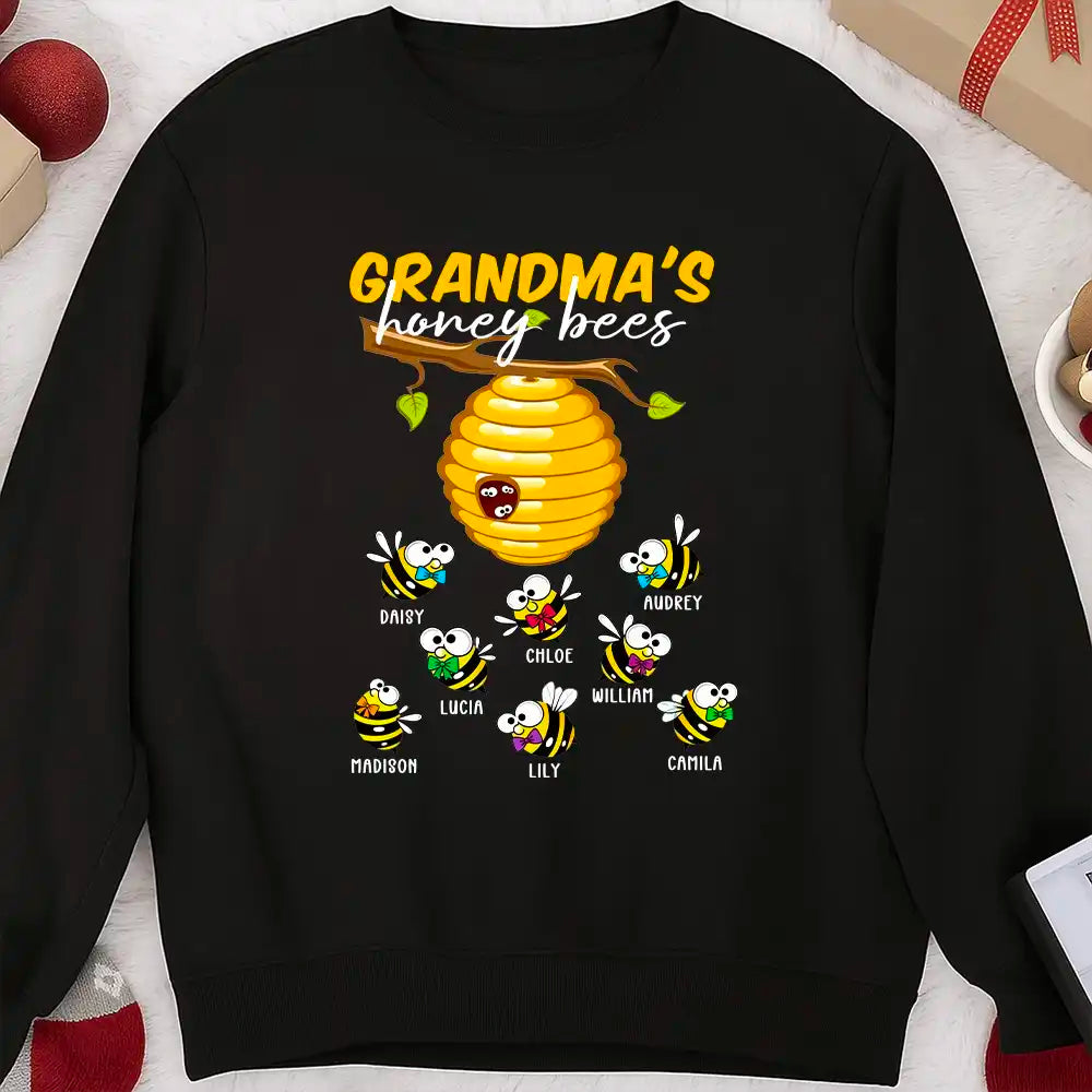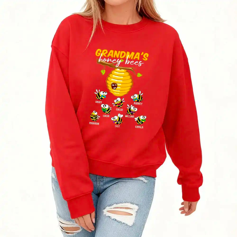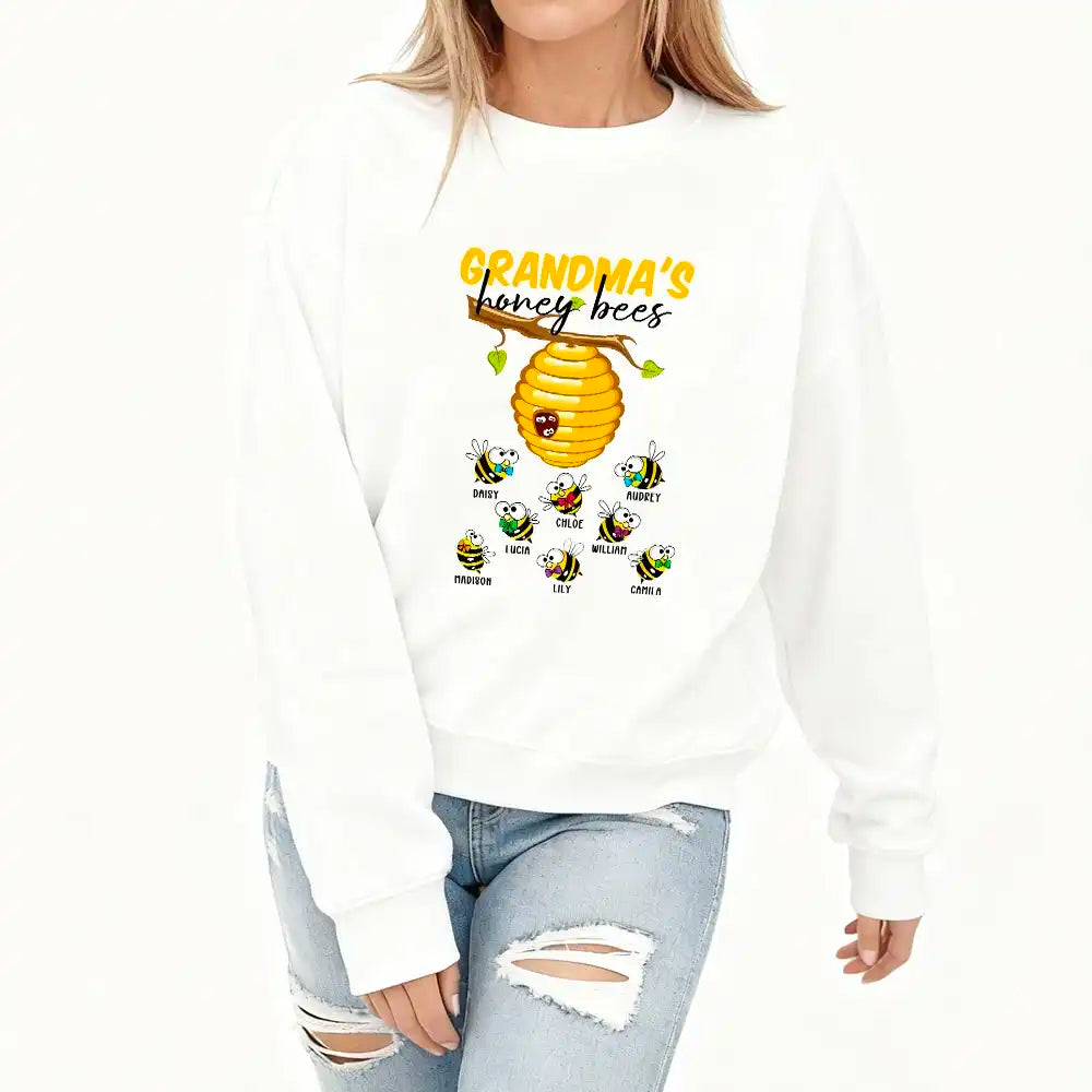 Express your love for Grandma in the sweetest way with this personalized "Grandma's Bee" sweatshirt. Each adorable bee represents a grandchild, with a custom name printed below the cheerful honeycomb pattern.