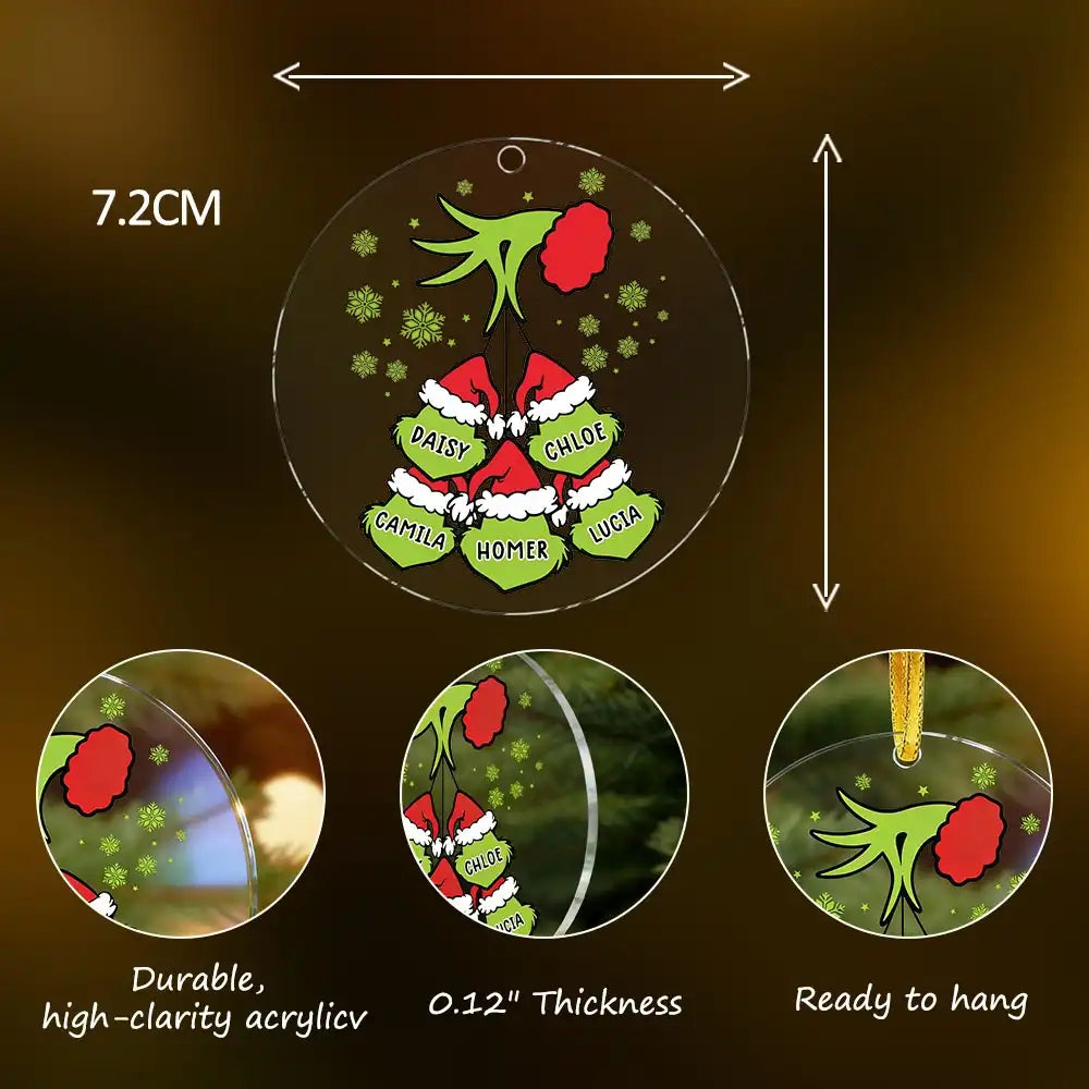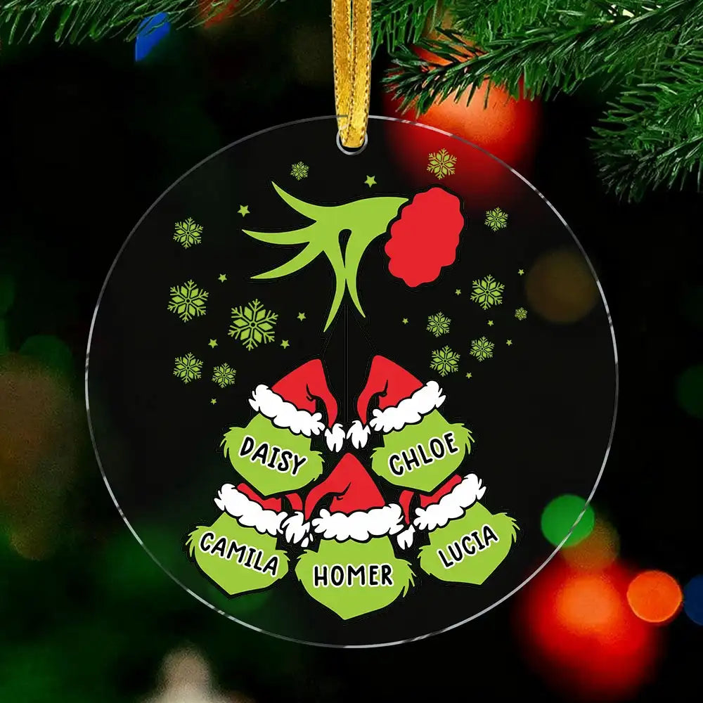 This personalized Grinch family acrylic Christmas ornament brings a fun and whimsical touch to holiday decorating. Customize each name to create a unique keepsake featuring a playful Grinch hand and festive hats for every family member. Made from durable acrylic with vibrant printing, this ornament is perfect for families who love humorous Christmas themes. Ideal for tree decorating, holiday gifting, and memorable family displays.