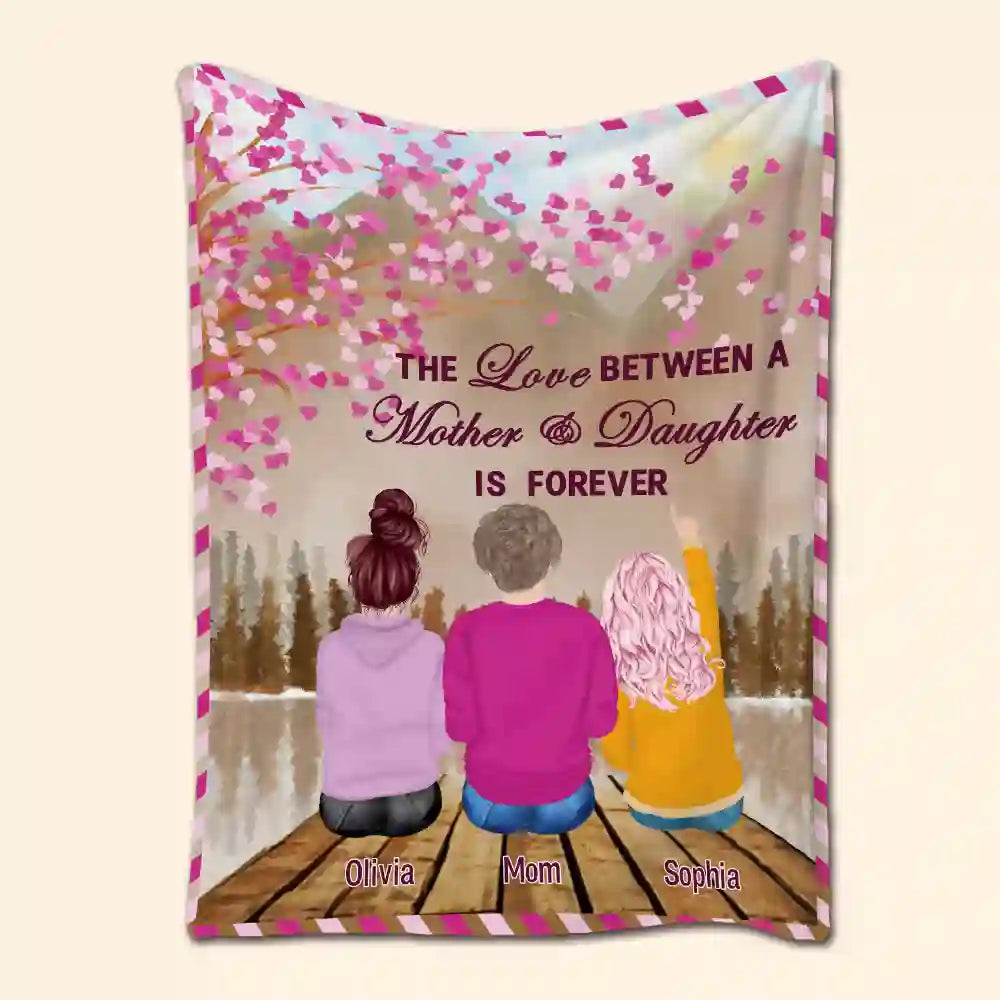 Featuring a beautiful back-view illustration of Mom and her girls under blooming heart-shaped trees, this cozy flannel blanket can be customized with each family member’s name and hairstyle to make it truly one-of-a-kind. The touching quote “The Love Between a Mother & Daughter Is Forever” adds a timeless message of love and connection.