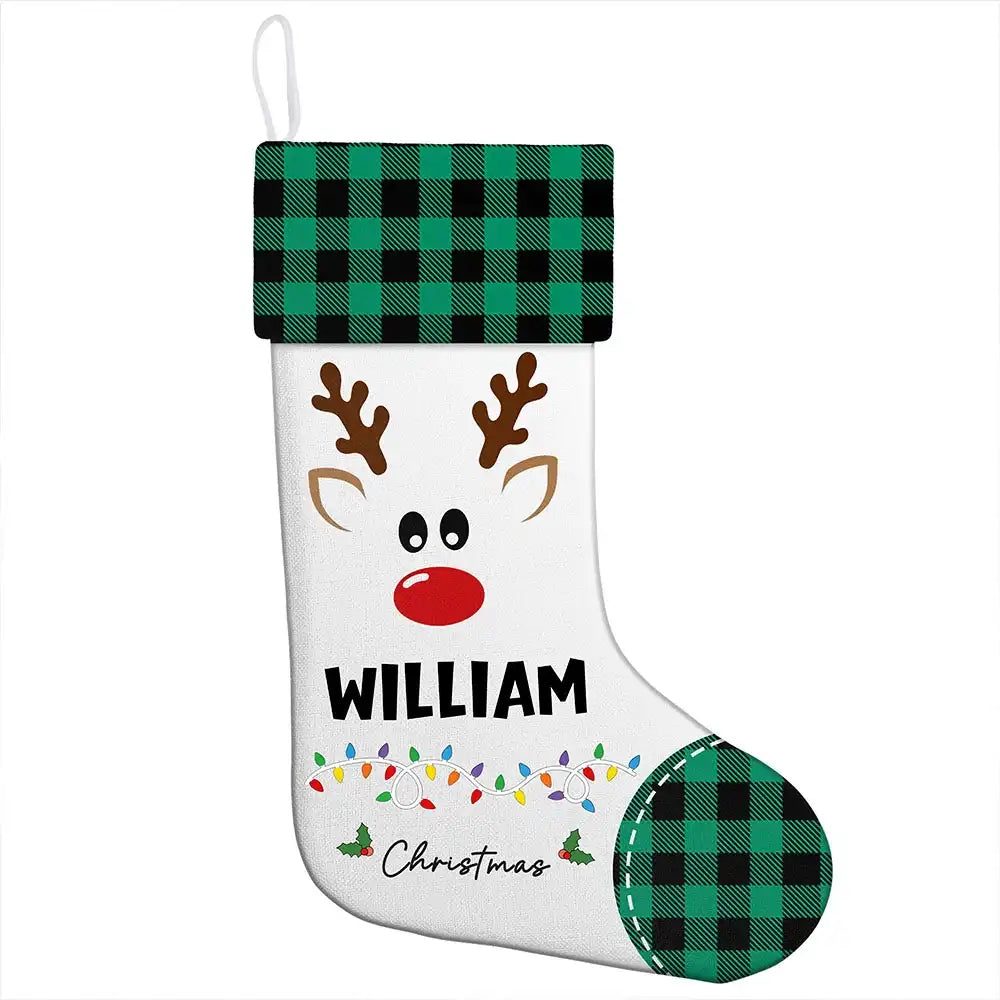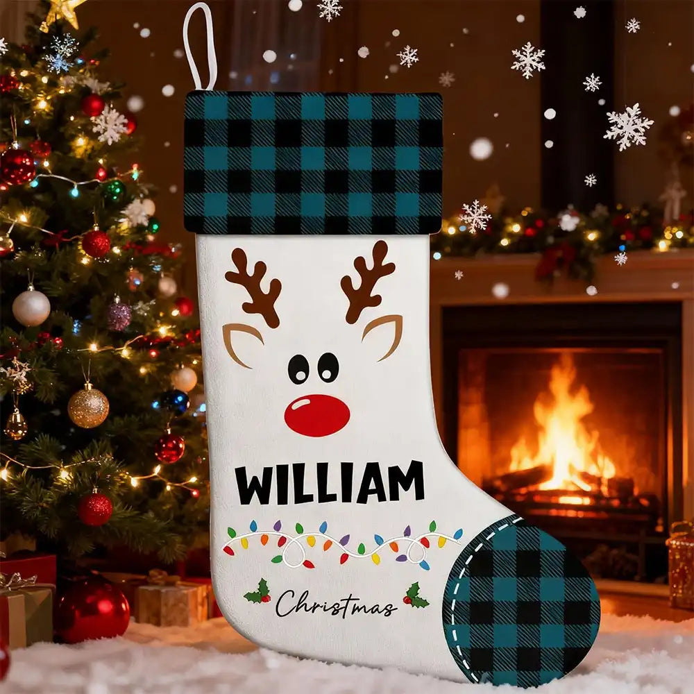 This personalized reindeer Christmas stocking, printed with your loved one's name, will make your Christmas decorations truly unique. Made from classic multi-colored plaid fabric and featuring an adorable red-nosed reindeer, it's perfect for children, adults, and pets alike. The heartwarming design and customizable details make it an ideal keepsake or gift for the holiday season.