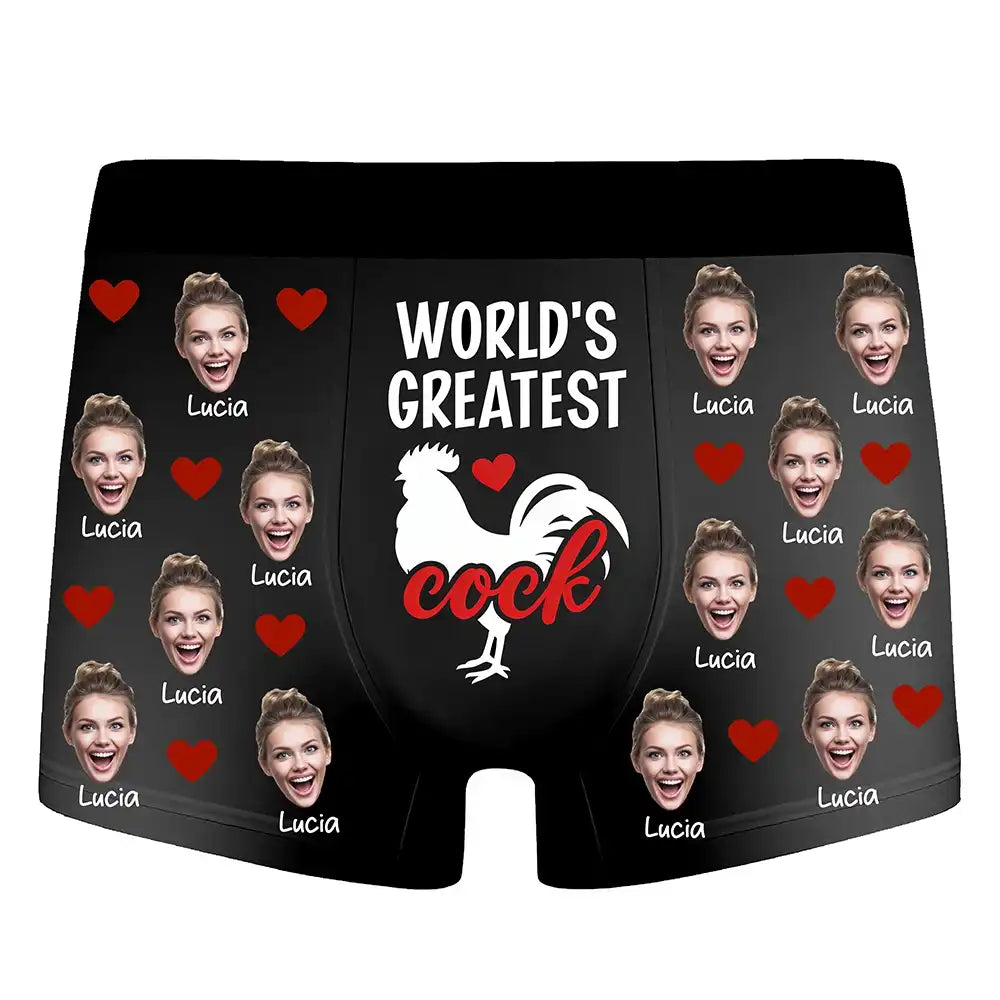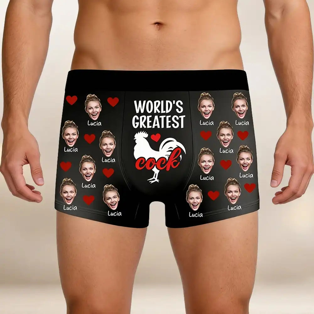 These personalized boxer briefs feature your custom photo along with the playful World's Greatest Rooster design, creating a fun and memorable gift for your husband or boyfriend. Made from soft and comfortable fabric with vibrant all-over printing, these boxers add humor and personality to any occasion. Perfect for Valentine’s Day, anniversaries, birthdays, or as a unique surprise that brings laughter and charm to your relationship. Simply upload a face photo to create a pair that is bold, personal, and unforgettable.